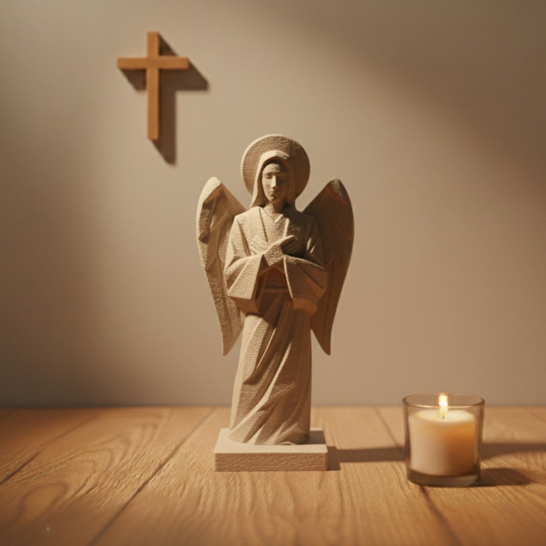 O Anjo Sagrado simboliza a presença divina que acalma, orienta e fortalece o coração. Com postura suave e expressão cheia de paz, ele representa a pureza celestial e a luz que Deus envia para guardar e inspirar seus filhos.