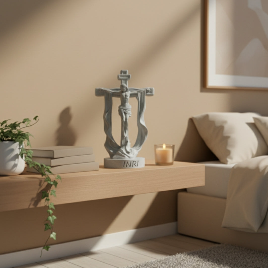 O Crucifixo com Manto revela a união entre o sacrifício e a glória. O manto que envolve a cruz simboliza a vitória do amor sobre a dor, trazendo à memória a promessa de redenção e vida eterna.