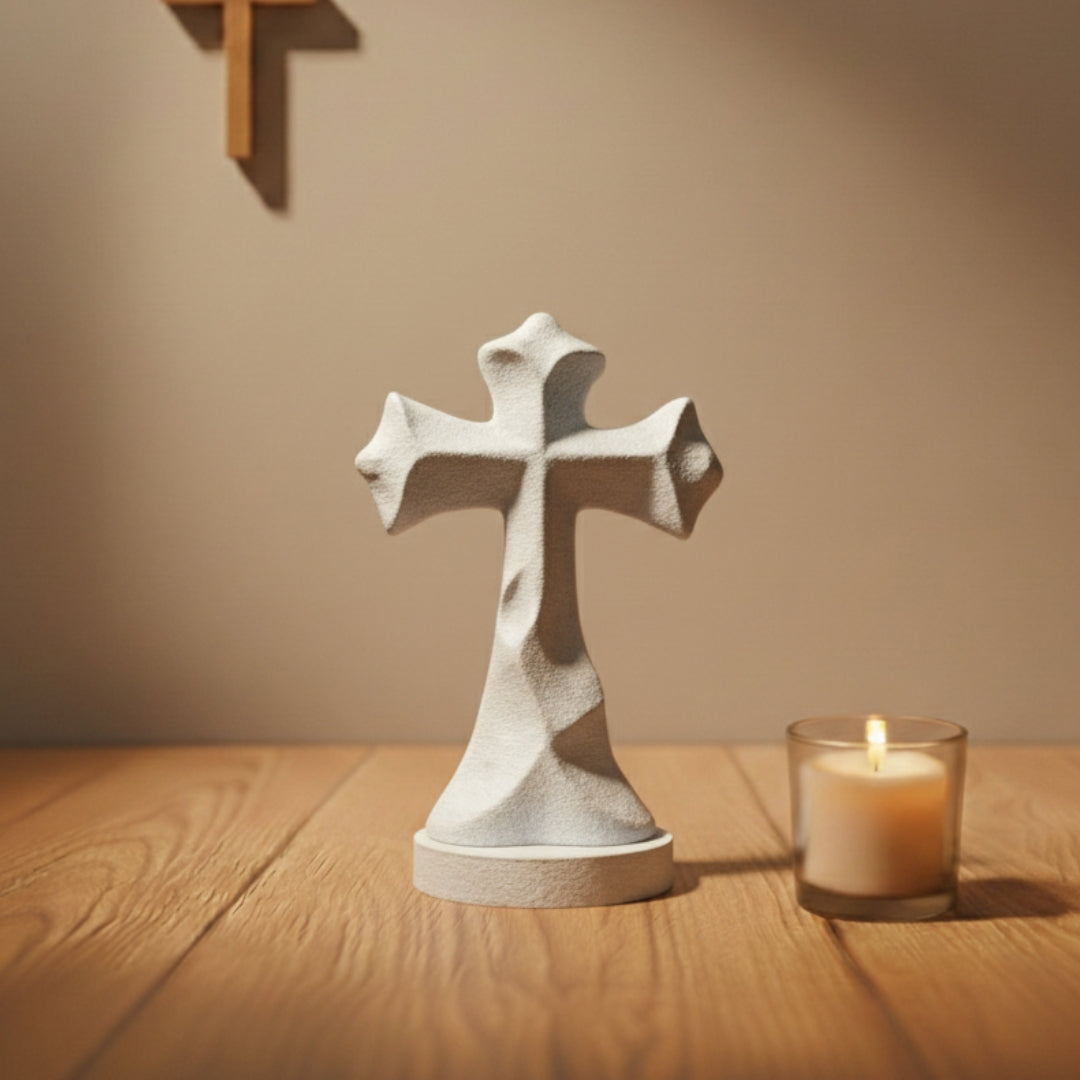 A Cruz Entalhada é um símbolo de fé e contemplação. Seu formato, marcado pela abertura em cruz no centro, convida à luz e à presença de Deus que atravessa todas as coisas, lembrando-nos do sacrifício e da esperança que brotam da cruz de Cristo.