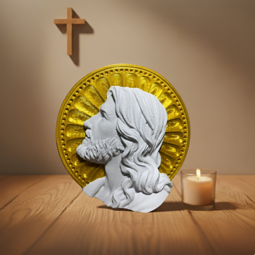 A imagem de Jesus com auréola dourada reflete a glória e a majestade do Cristo Ressuscitado. Seu semblante sereno e luminoso revela o triunfo da vida sobre a morte e a presença eterna do amor divino.